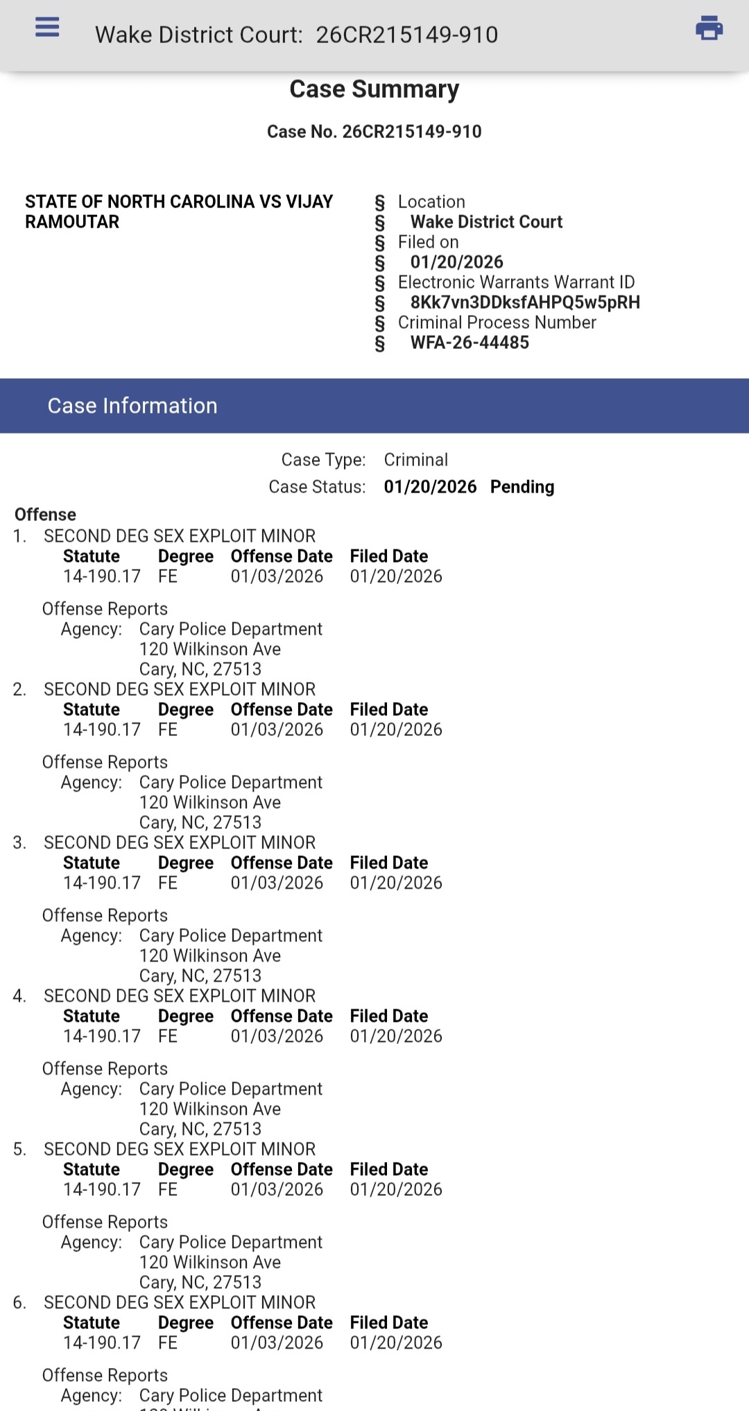 Vijay Ramoutar, who in the same ring as a cp buyer of Andrew Martinez, the babysitting molester, has been CHARGED with 20 counts of child porn! There is a warrant out for his arrest