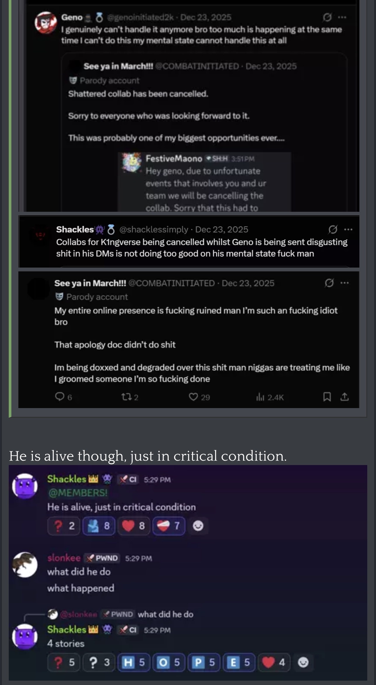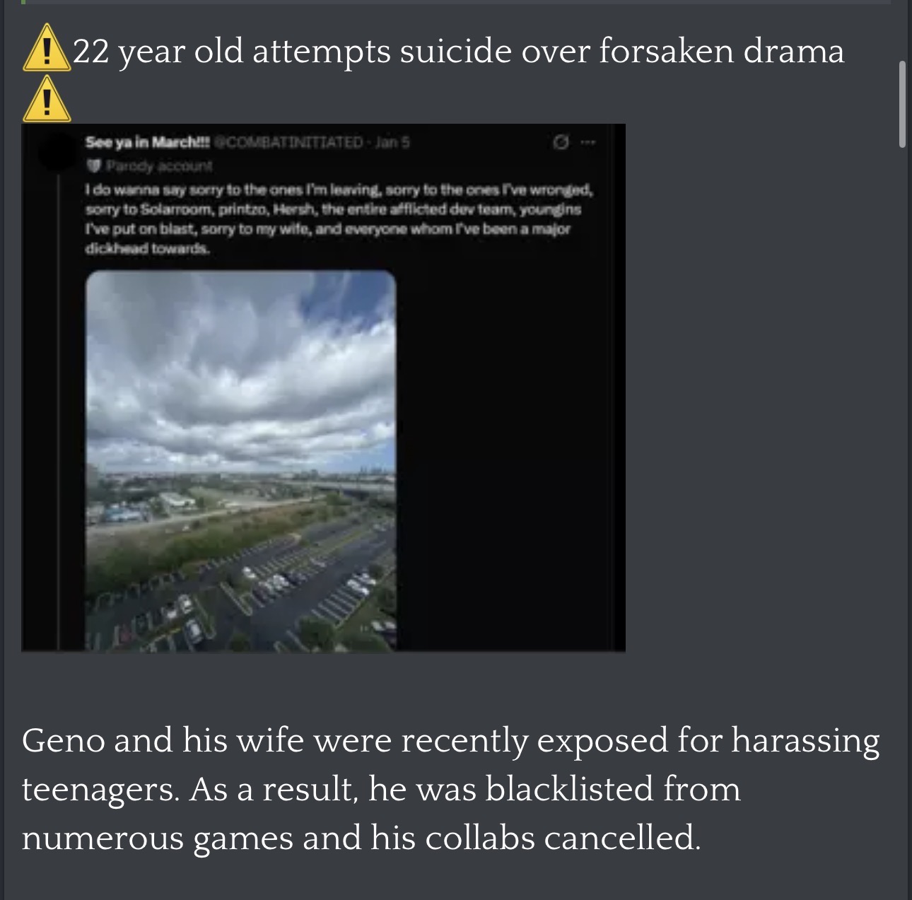 “Roblox contributor Geno is in critical condition after jumping off a 4-story building. His suicide attempt came after he was doxed for harassing a minor.”