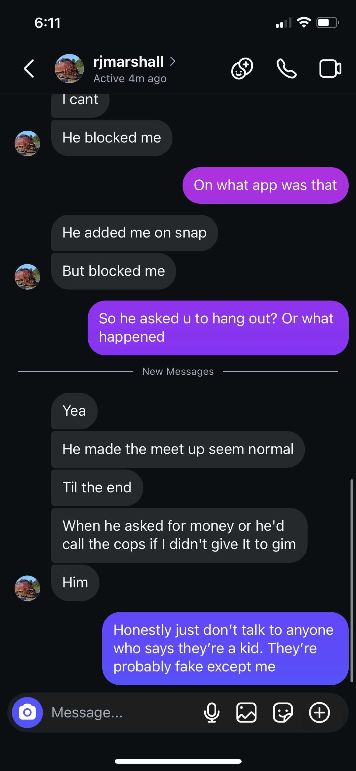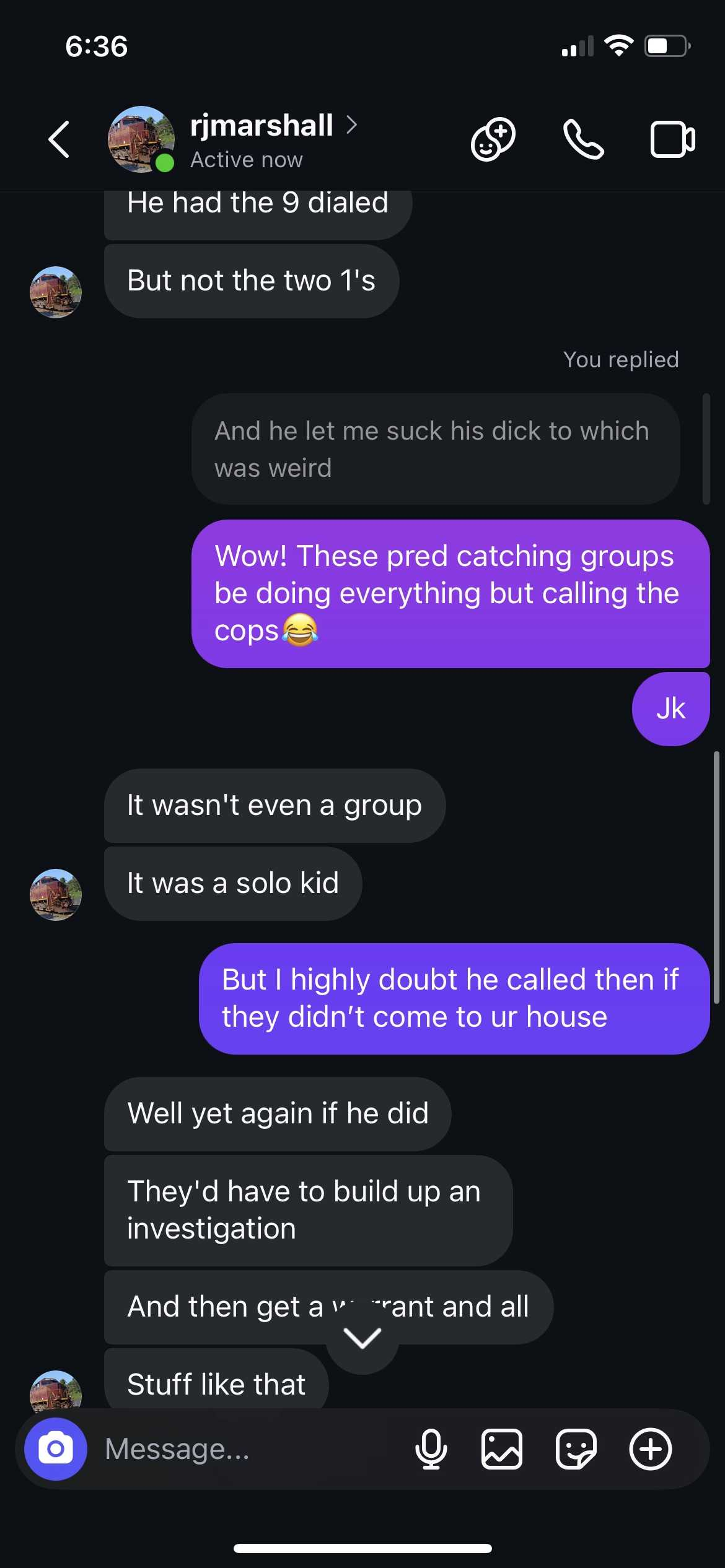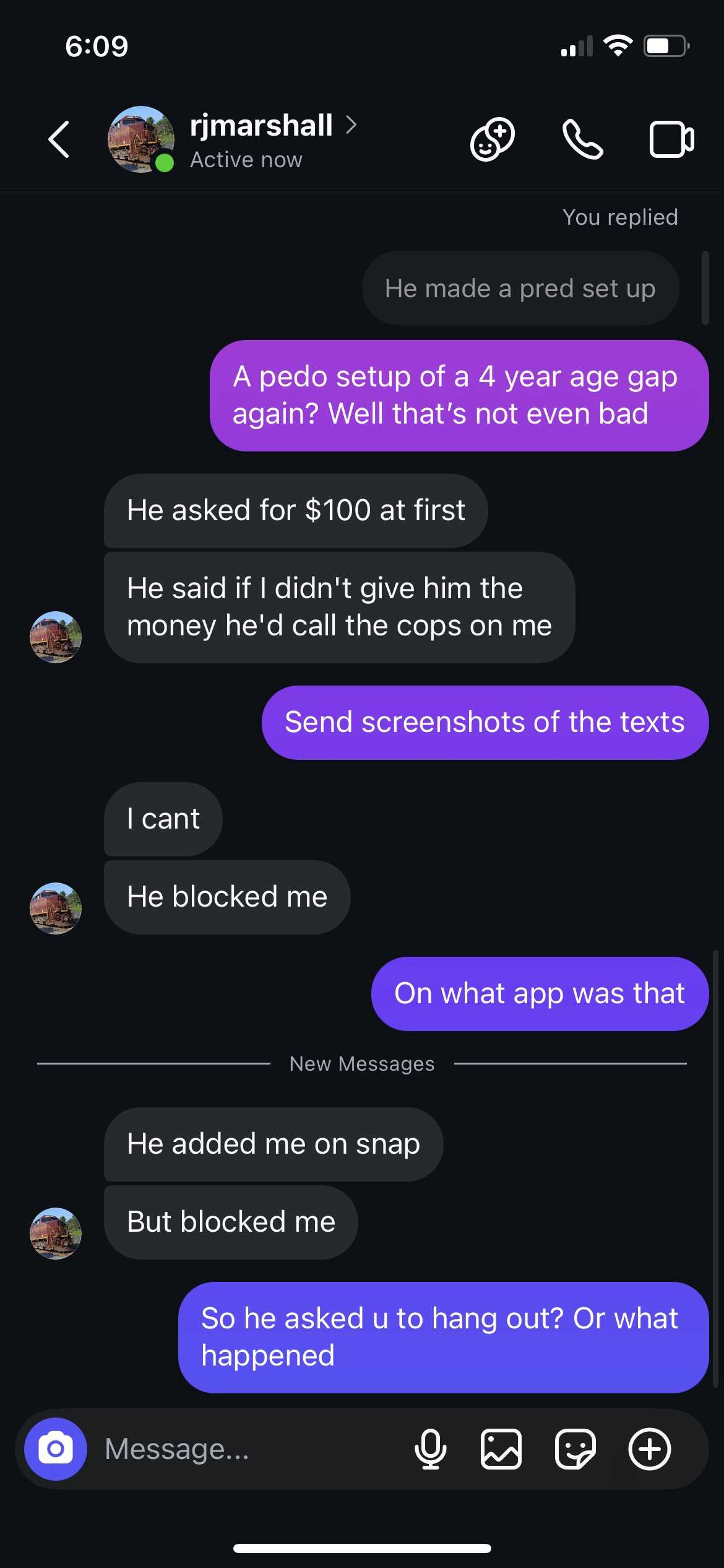 Then, very recent (shortly before we caught him), here’s him ALSO telling me about when a “16 year old boy” met up with him off Snapchat and then they had oral sex but then the boy pulled his phone out, started filming, and forced RJ to give money or he’d call the cops. This made RJ so terrified to meet me (the 13 year old PP decoy) later on, but he still went through with it anyway. Here’s him telling me about the 16 yr old who robbed him after gay sex...