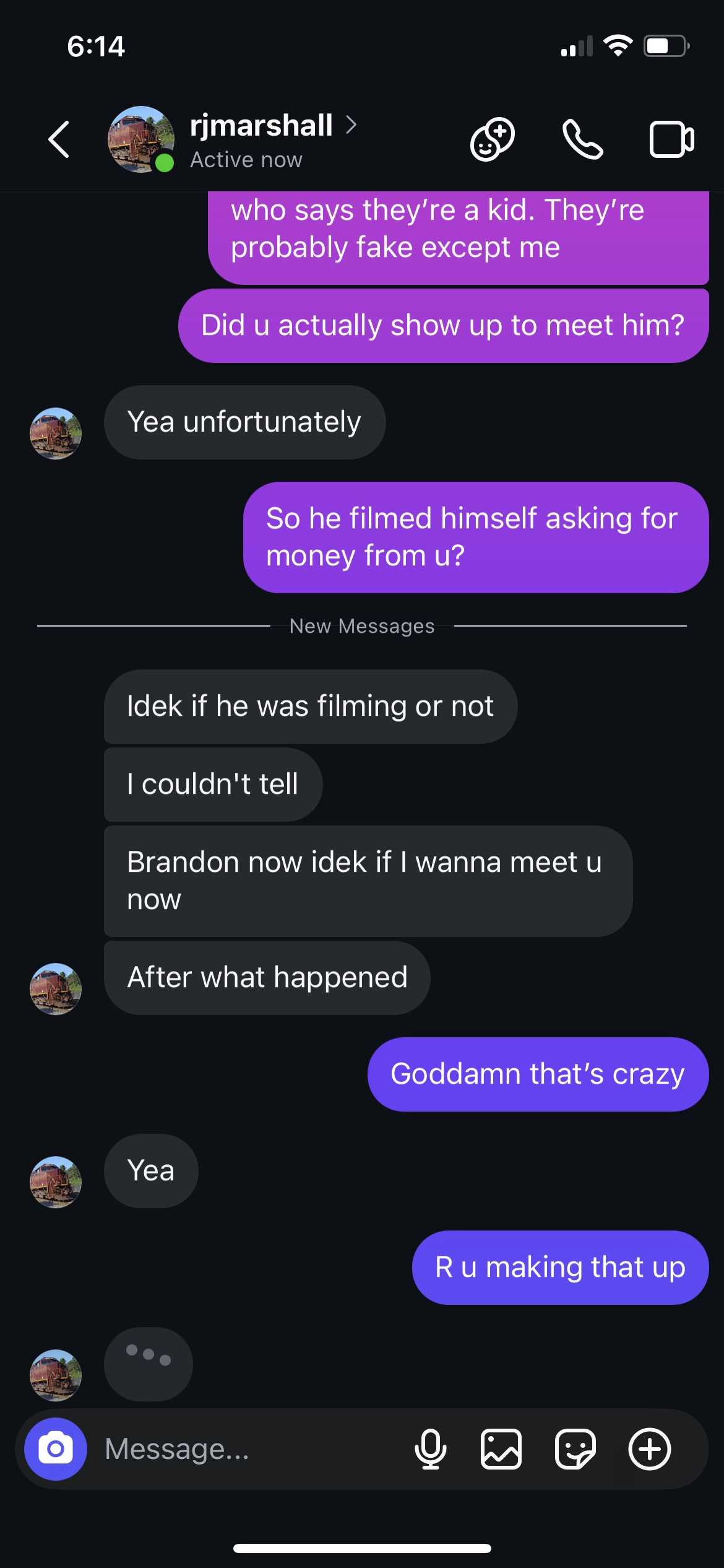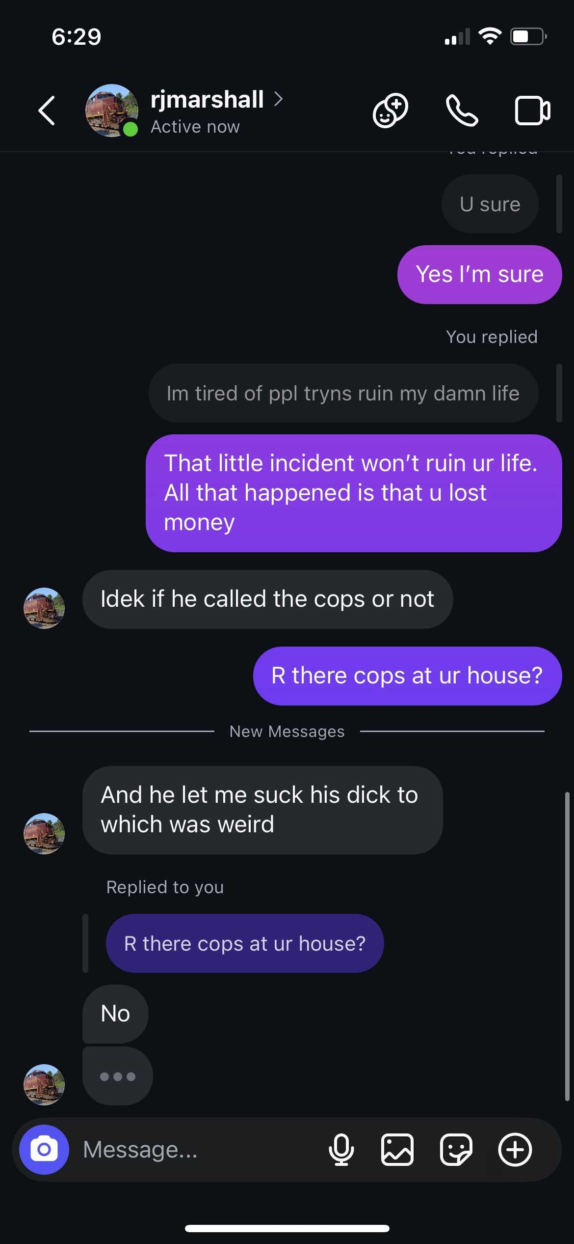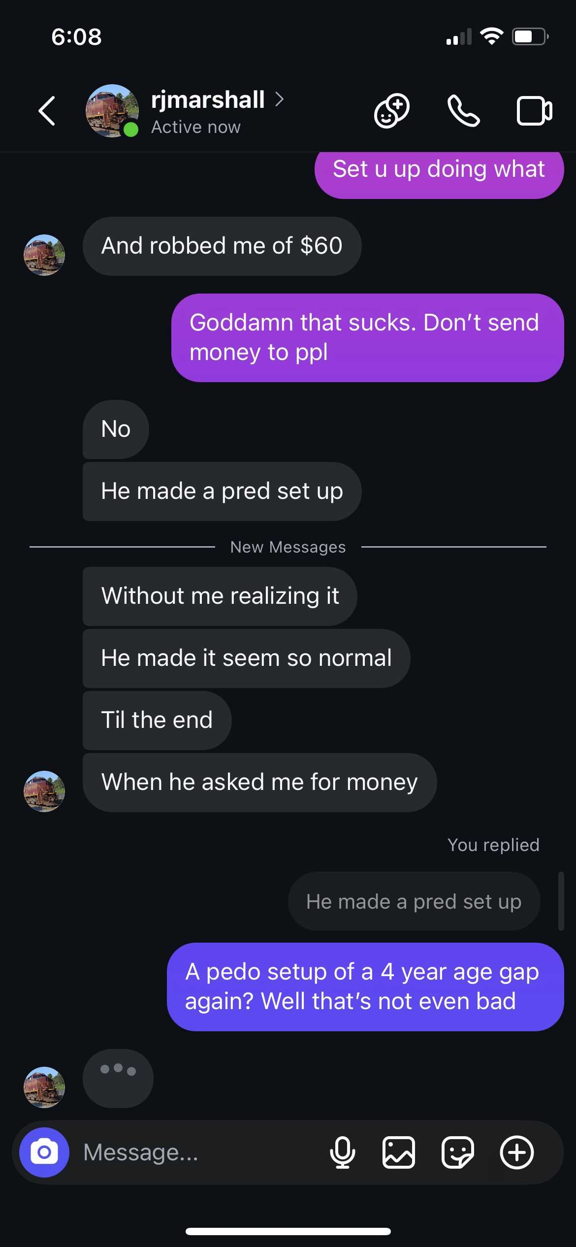 Then, very recent (shortly before we caught him), here’s him ALSO telling me about when a “16 year old boy” met up with him off Snapchat and then they had oral sex but then the boy pulled his phone out, started filming, and forced RJ to give money or he’d call the cops. This made RJ so terrified to meet me (the 13 year old PP decoy) later on, but he still went through with it anyway. Here’s him telling me about the 16 yr old who robbed him after gay sex...
