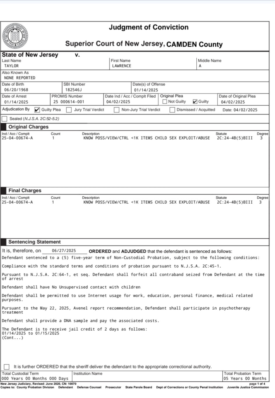 Lawrence Taylor, the pedo we caught in January in Pennsauken, has been CONVICTED! I didnt even know he was arrested lol... glad the cops followed up when we turned him in. 5 years probation
