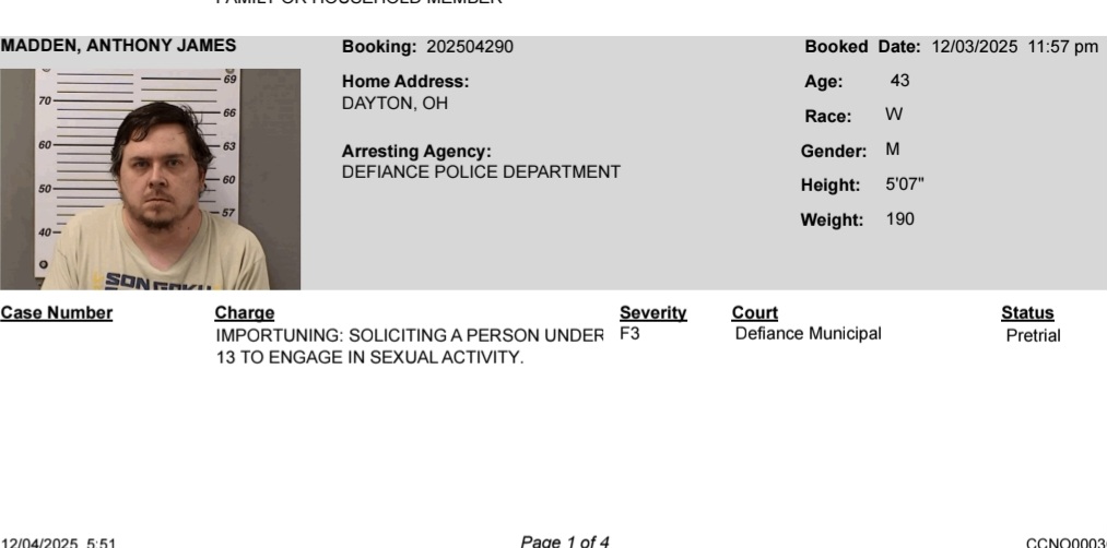 His preliminary charge is basically solicitation.. obviously more will come once Dayton Police department is looped in by Defiance PD.