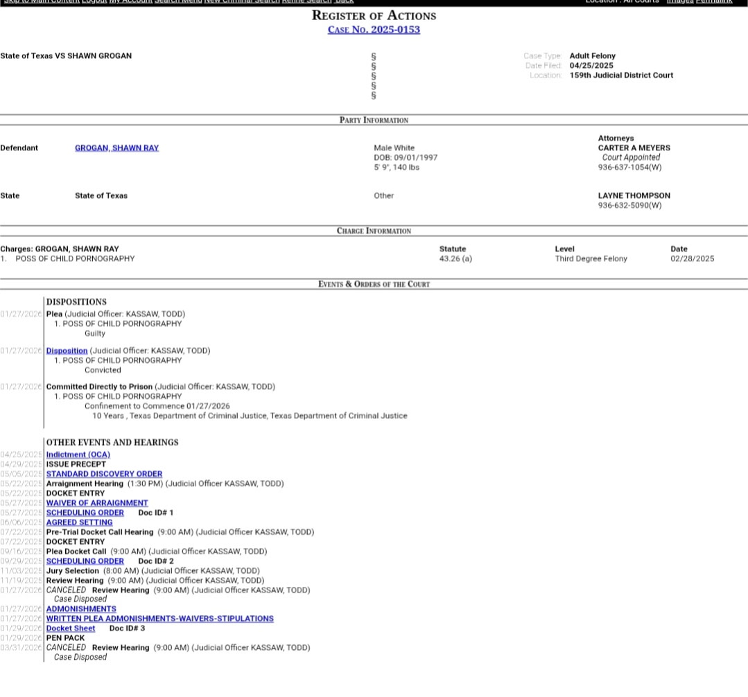 Shawn Grogan, a pedo we caught last year in Lufkin, has been CONVICTED AND SENTENCED to 10 years in prison! Nice!