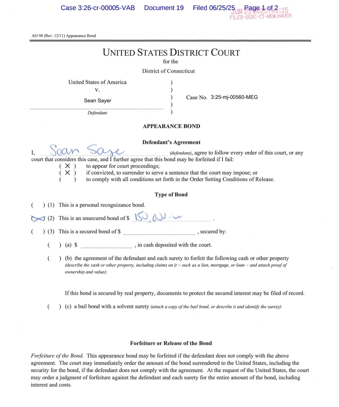 Judge releases him on $150,000 bond.